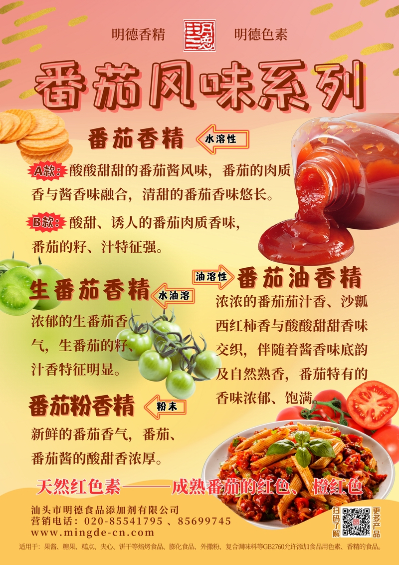 明德番茄風(fēng)味系列香精 酸甜鮮爽 覆蓋多樣應用場(chǎng)景汕頭市明德食品添加劑有限公司推出的番茄風(fēng)味系列香精,覆蓋水溶性、油溶性與粉末香精,兼顧番茄醬、鮮番茄與成熟番茄等多種風(fēng)味調性。產(chǎn)品真實(shí)穩定,適用于飲料、醬料、烘焙、休閑等多種B端場(chǎng)景。